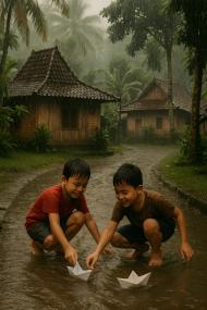 Two young boys playing with paper boats on a rain-flooded path in a tropical village. They are laughing and enjoying the rainy day, surrounded by traditional wooden houses and lush green trees. A heartwarming moment of simple childhood joy in a rural setting.