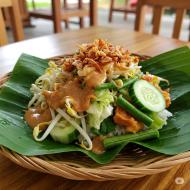 Gado-gado is a traditional Indonesian dish made from a mix of fresh vegetables such as bean sprouts, cabbage, cucumber, and long beans, served with rice or rice cakes and topped with a thick peanut sauce. It is garnished with crispy fried shallots, offering a combination of savory, spicy, and fresh flavors in one plate. Traditionally served on banana leaves.
